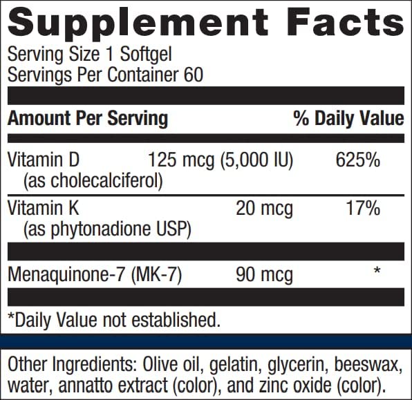 D3 5,000 + K provides 5,000 IU per softgel of vitamin D (as D3), designed for greater absorption. This high-potency formula also includes bioavailable forms of vitamin K2 (menaquinone-7) to complement vitamin D.