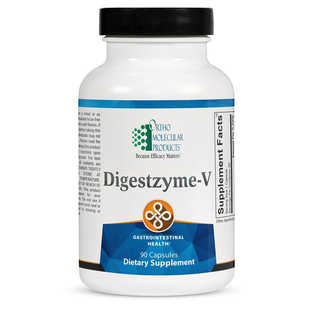 Because of our hectic lifestyle, and the way we often consume food that is frequently overcooked, digestion can often be less than optimal. Poor digestion can produce bloating and occasional gas, cramping, diarrhea or constipation, and even lead to incomplete digestion of food proteins that have been linked to food sensitivities. Conversely, more thorough digestion of foodstuffs with enzymes prevents foods from being fermented in the gut and the proliferation of "bad" bacteria and yeast at the expense of "good" intestinal bacteria. More complete digestion of carbohydrates removes the food source for these bad organisms. Another benefit of enzymes is that more nutrition can be derived from food. In addition, regular bowel movements result from this better digestion. Digestzyme-V is specifically designed to support digestion and help unlock more nutrition from food.